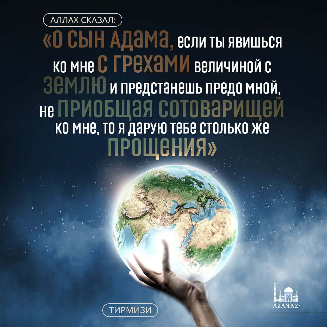 «О сын Адама, если ты явишься ко Мне с грехами величиной с Землю и предстанешь предо Мной, никого не приобщая в сотоварищи ко Мне, то Я дарую тебе столько же прощения».