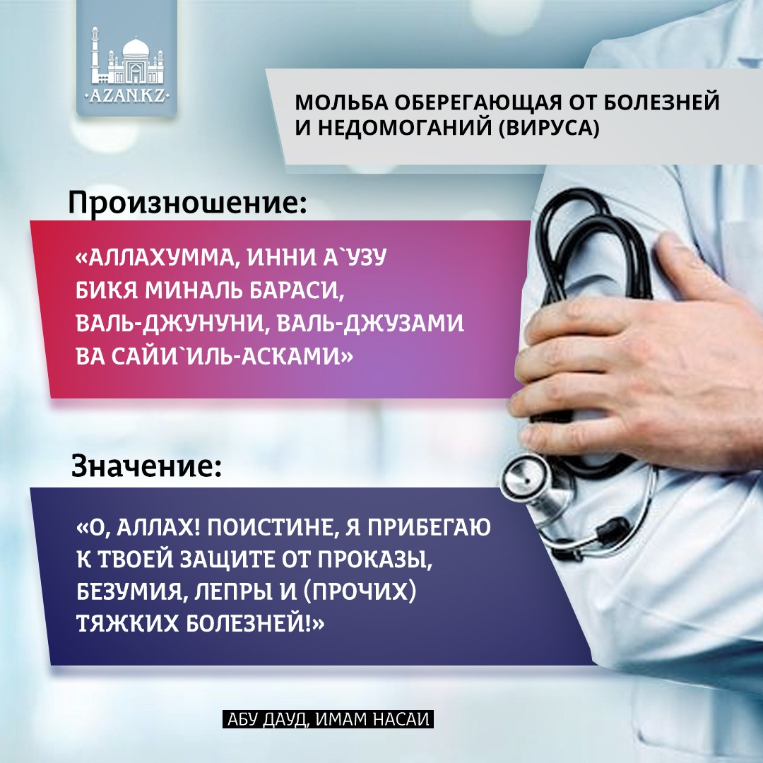 «О, Аллах! Поистине, я прибегаю к Твоей защите от проказы, безумия, лепры и (прочих) тяжких болезней!»