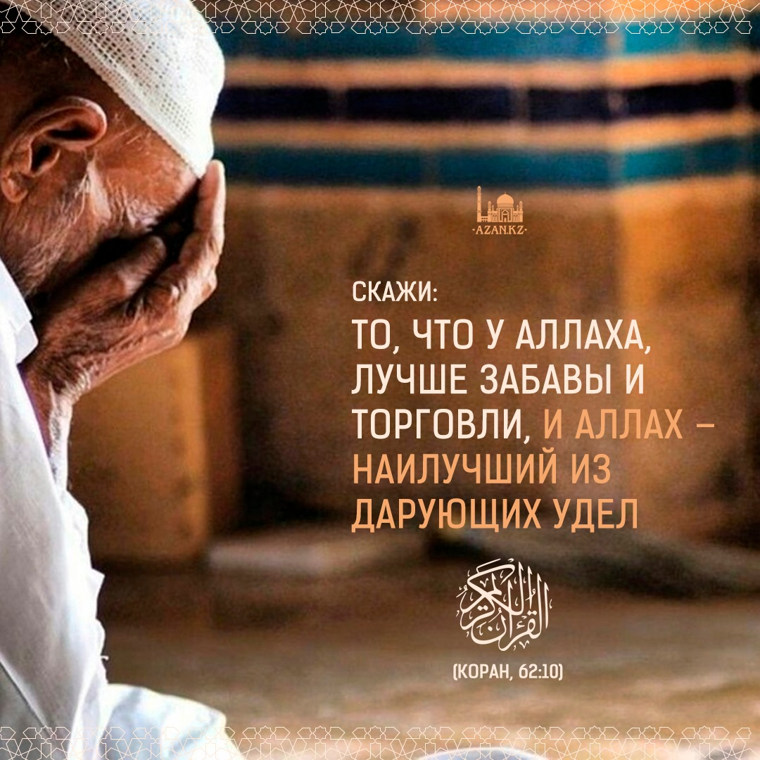"Когда же они увидели торговлю или забаву, они разошлись, бросившись к ней, и оставили тебя стоять во время пятничной проповеди. Скажи: «То, что у Аллаха, лучше забавы и торговли, и Аллах – Наилучший из дарующих удел"..