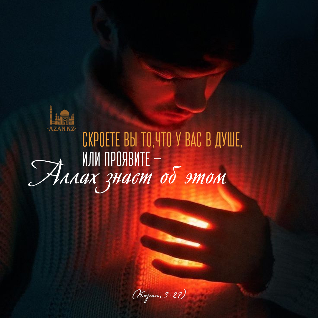 «Скажи (им, Мухаммад): «Скроете вы то, что у вас в душе, или проявите — Аллах знает об этом. Он знает обо всем, что в небесах и на земле. Аллах — Всемогущий». (3:29).