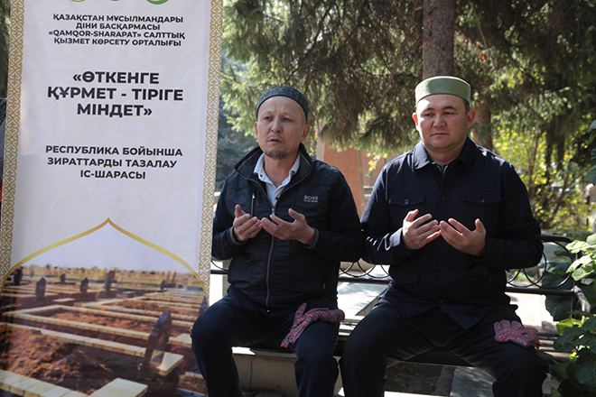 Қазақстан мұсылмандары діни басқармасы бастамасымен «Өткенге құрмет-тіріге міндет» атты республикалық тазалық шарасы өткізілді. Сауапты да игі амалға ҚМДБ «Qamqor-Sharapat» ЖШС директоры Мейрамбек Қабылбекұлы, Алматы қаласы «Qamqor-Sharapat» ЖШС филиалының директоры Талғат Дайрабайұлы және қала мешіттерінің имамдары мен жамағаты үлес қосты. Қаладағы сегіз аудан имамдары мен мешіттің дін қызметкерлері, қала тұрғындары мен ерікті жастар әр ауданға қарасты зираттарды қоқыстан тазартты.