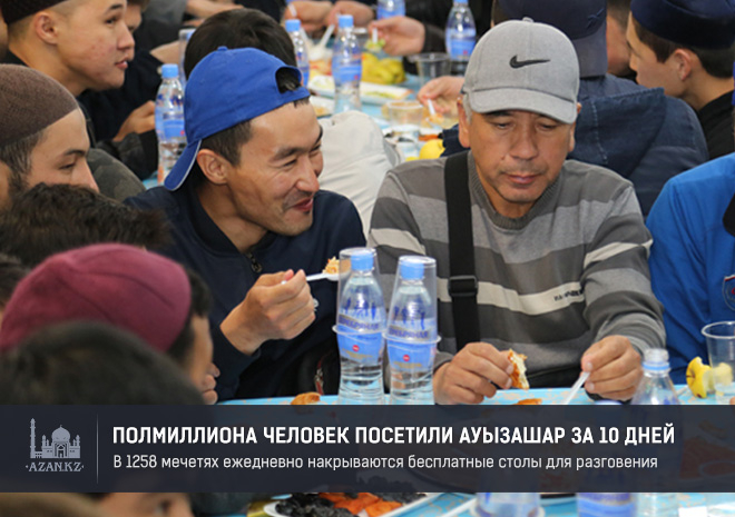 «С начала священного месяца Рамазан в мечетях страны за первые 10 дней ауызашар был организован для 534 263 человек. На сегодняшний день в 1258 мечетях по всему Казахстану ежедневно накрываются бесплатные столы для разговения, охватывающие нуждающихся граждан».