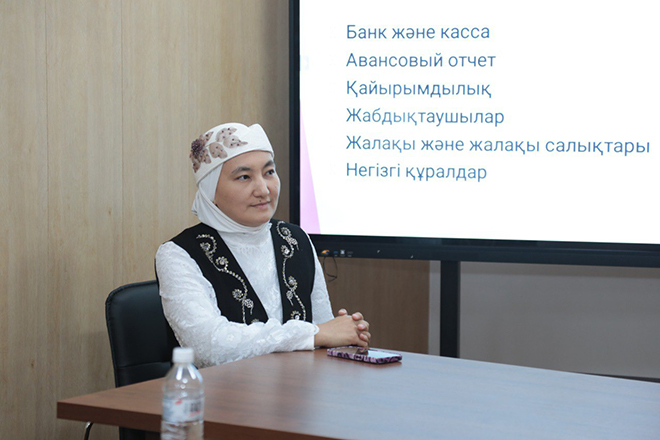 Мешіт есепшілеріне «Бухгалтерлік есеп ақпараттық жүйе ретінде» тақырыбында есептің мақсаты мен міндеті жайлы кеңінен тарқатып айтты. Аналитикалық ойлауды, сандар тілін түсінуді, түрлі жағдайларда дағдарыстың шұғыл түрде алдын алу және қажетсіз қаржылық шығындарды болдырмау жайын жеткізді. Сонымен қатар слайд түрінде есеп-қисап жайлы негізгі құралдар түсіндірілді. «Бухгалтерлік жүйе - ұйымның қаржылық жағдайын өлшейтін, өңдейтін, есептейтін және осы ақпаратты қажет ететін пайдаланушыларға жеткізетін жүйе» - деп атап өтті Динара Есжанова.
