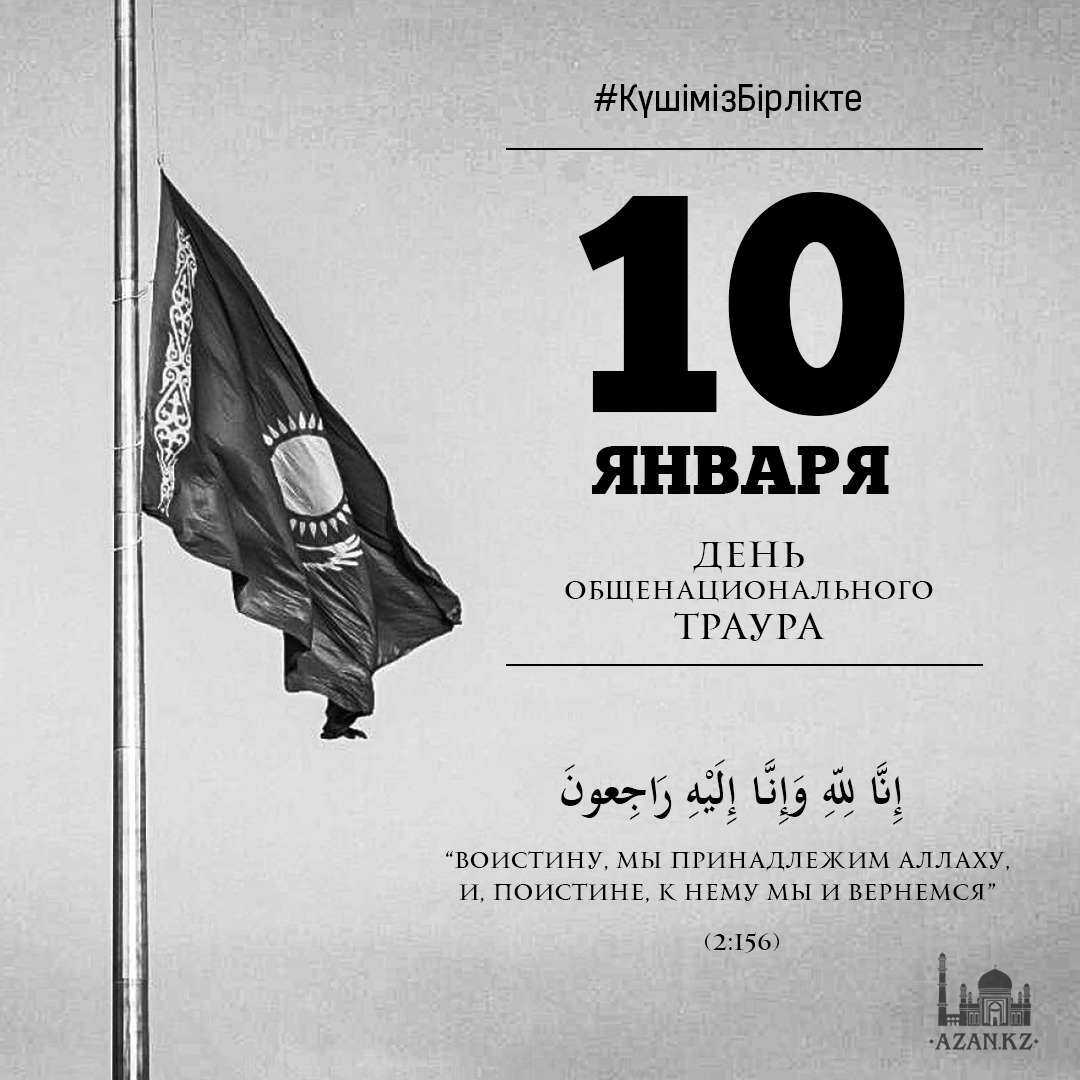 В связи с многочисленными человеческими жертвами в результате трагических событий в ряде регионов страны Президент Казахстана Касым-Жомарт Токаев объявил 10 января 2022 года днем общенационального траура. Сегодня в Казахстане приспустят все государственные флаги. В этот день мы отдаем дань памяти и уважения мирным жителям и сотрудникам правоохранительных органов, военнослужащим, погибших в ходе массовых беспорядков в стране.