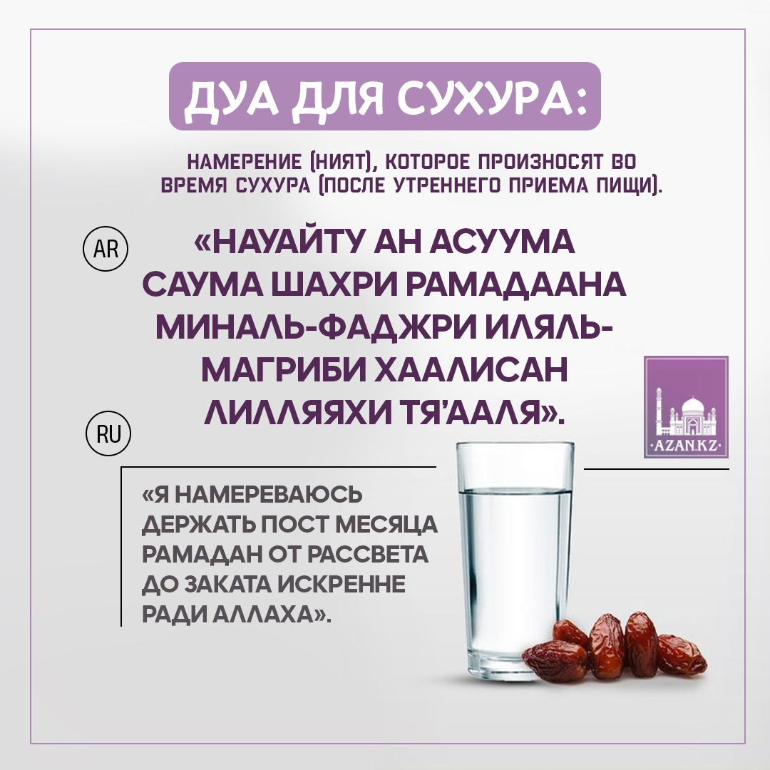 Перевод: «Я намерился держать пост месяца Рамадан от рассвета до заката искренне ради Аллаха».
