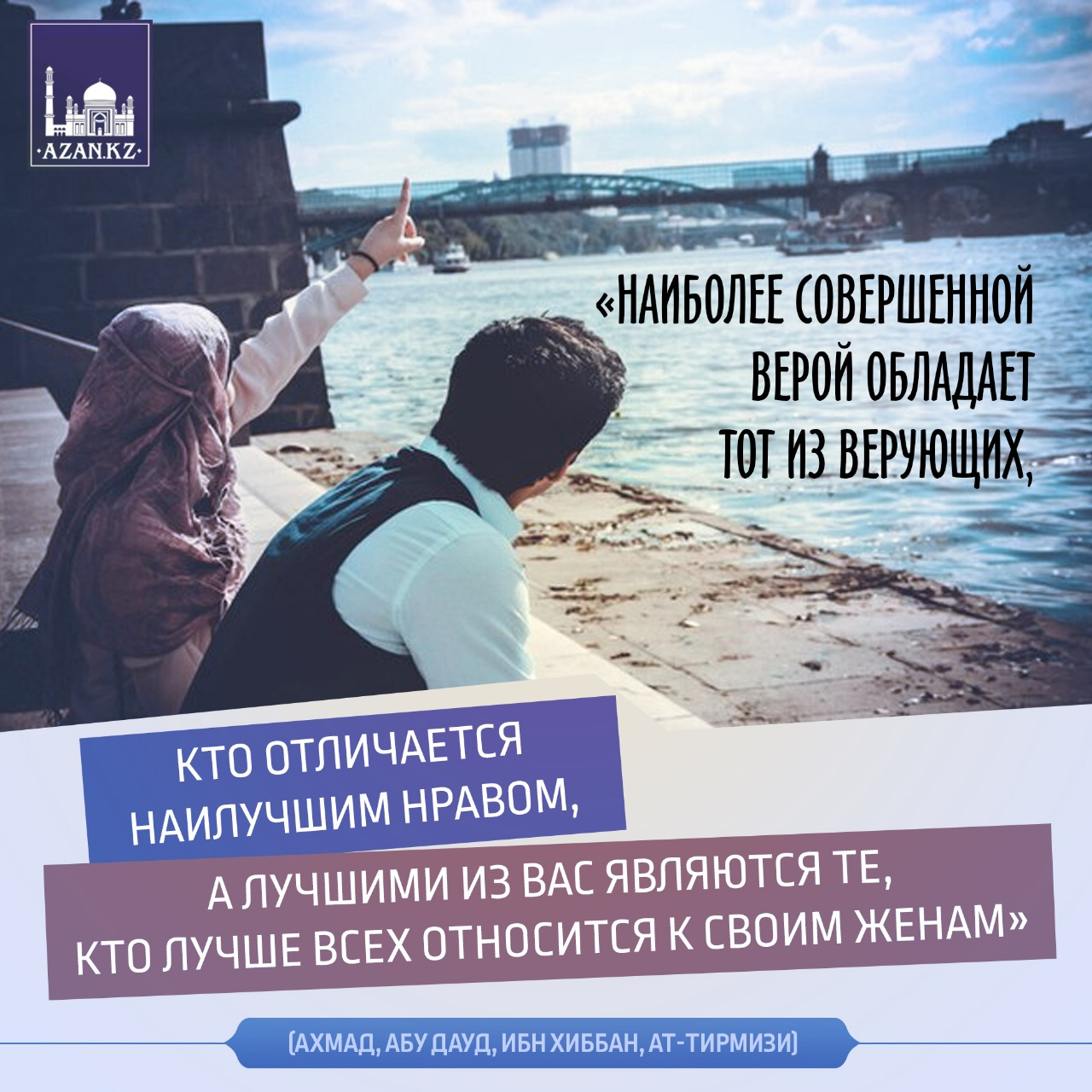 «Наиболее совершенной верой обладает тот из верующих, кто отличается наилучшим нравом, а лучшими из вас являются те, кто лучше всех относится к своим женам» (Ахмад, Абу Дауд, Ибн Хиббан, ат-Тирмизи)