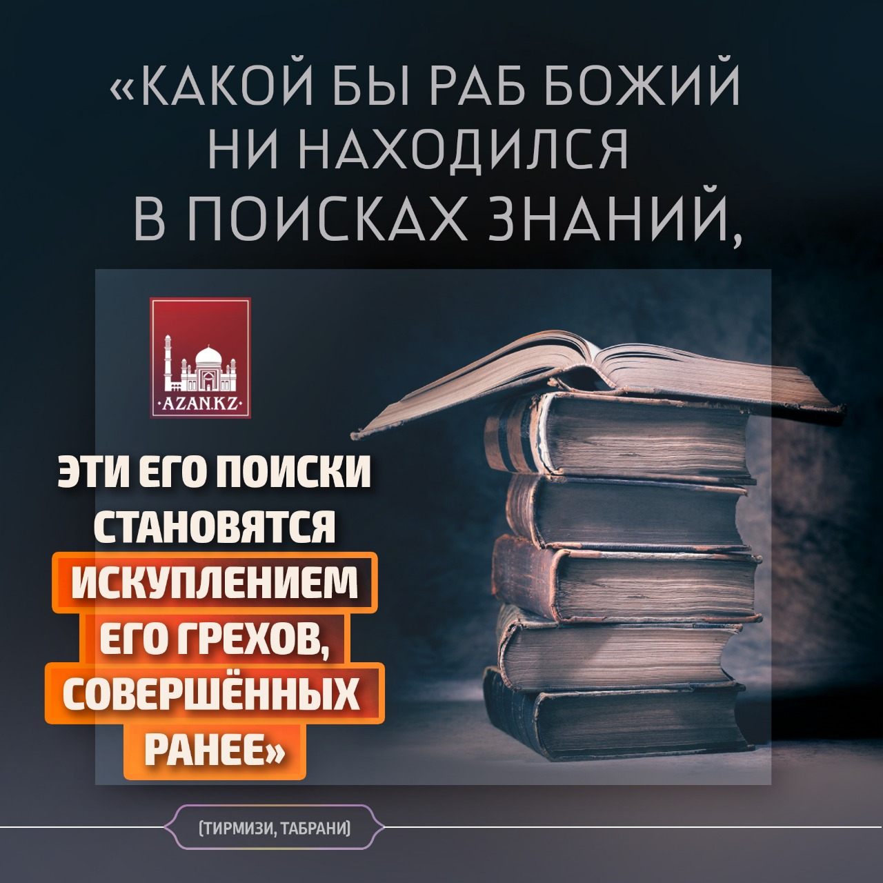 «Какой бы раб Божий ни находился в поисках знаний, эти его поиски становятся искуплением его грехов, совершённых ранее» (Тирмизи, Табарани).