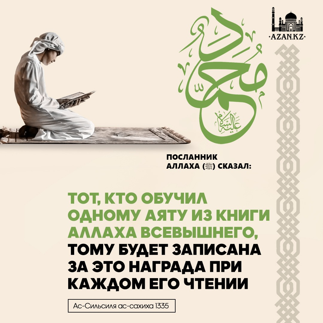 "Тот, кто обучил одному аяту из книги Аллаха Всевышнего, тому будет записана за это награда при каждом его чтении"
