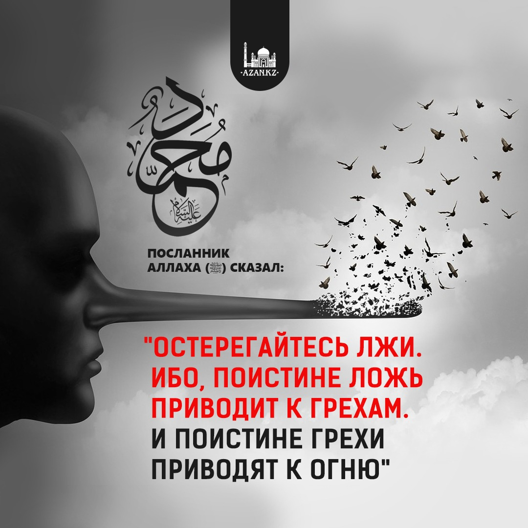 «Придерживайтесь правдивости. Ведь поистине правдивость приводить к благочестию. И поистине благочестие приводит к Раю. И будет человек правдивым и стремящимся к правдивости до тех пор, пока не будет записан у Аллаха как правдивейший. И остерегайтесь лжи. Ибо, поистине ложь приводит к грехам. И поистине грехи приводят к огню. И станет человек лгать и стремится ко лжи, пока не будет записан перед Аллахом как отъявленный лжец».