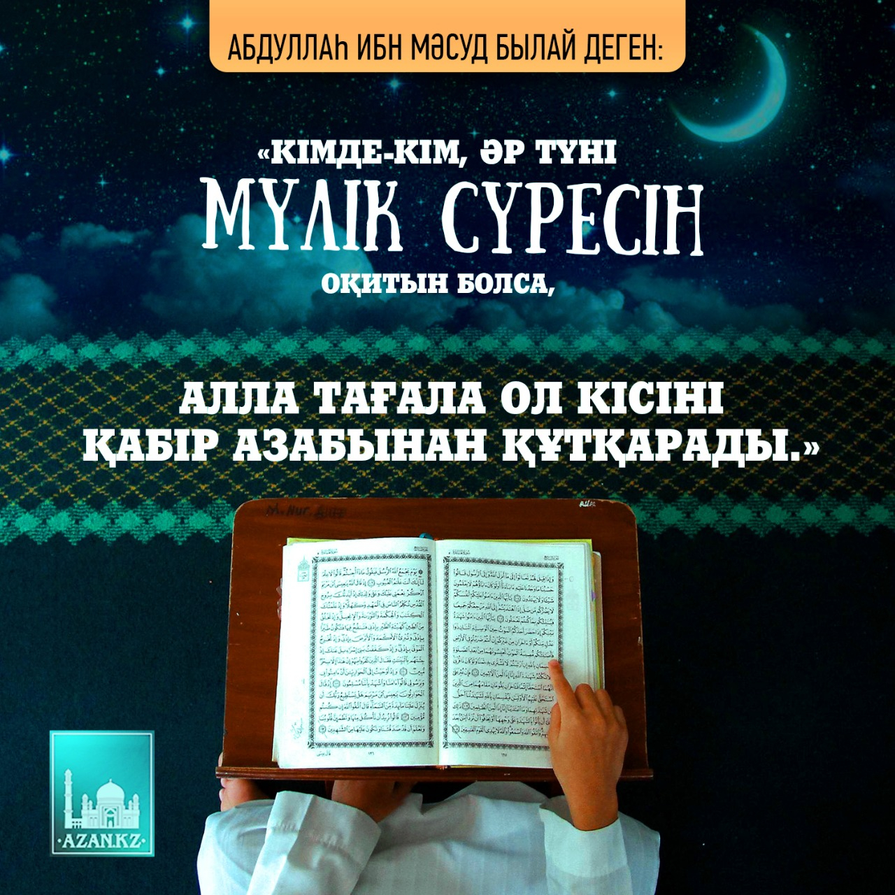 «Кімде-кім, әр түні Мүлік сүресін оқитын болса, Алла Тағала ол кісіні қабір азабынан құтқарады.»