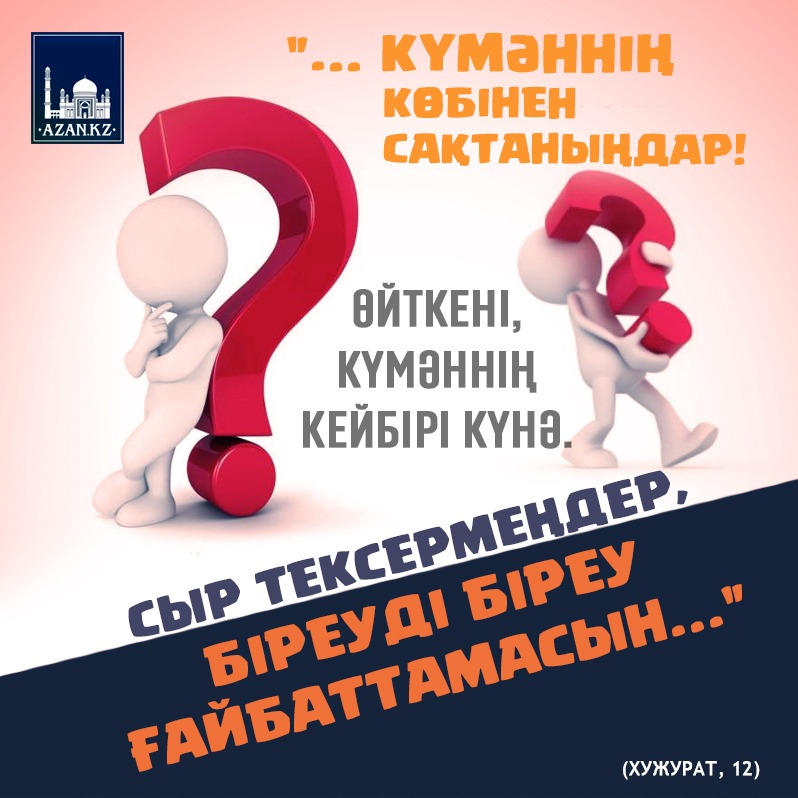 "... Күмәннің көбінен сақтаныңдар! Өйткені, күмәннің кейбірі күнә. Сыр тексермеңдер, біреуді біреу ғайбаттамасын..." (Хужурат, 12)