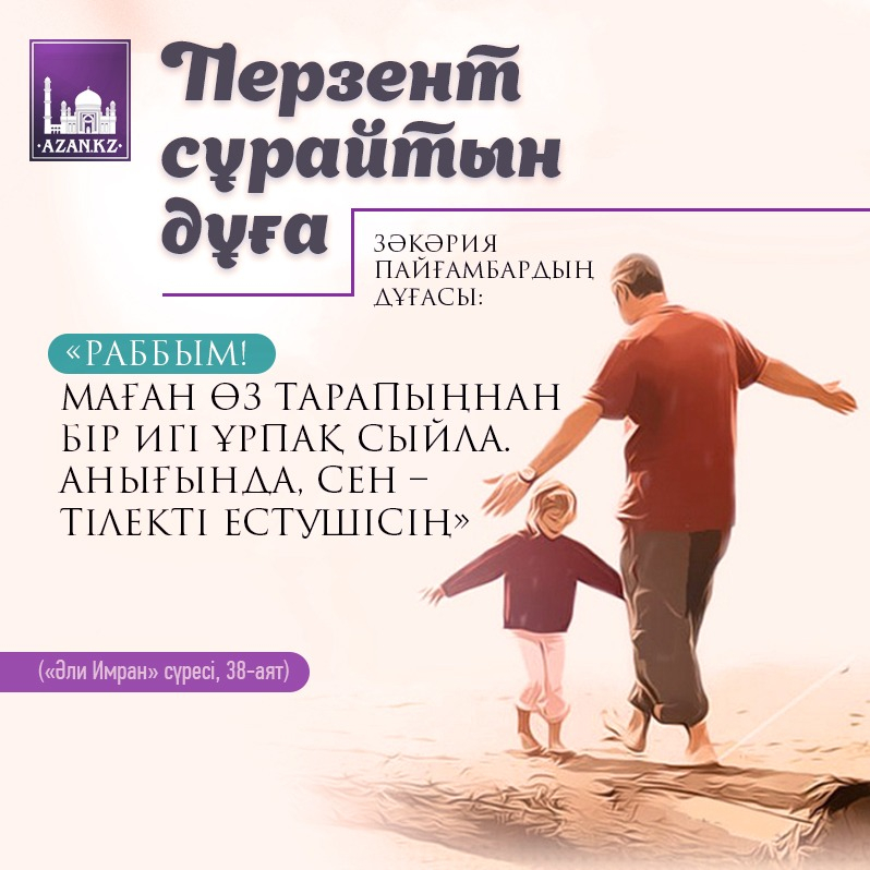 Мағынасы: «Раббым! Маған Өз тарапыңнан бір игі ұрпақ сыйла. Анығында, Сен – тілекті Естушісің» («Әли Имран» сүресі, 38-аят).