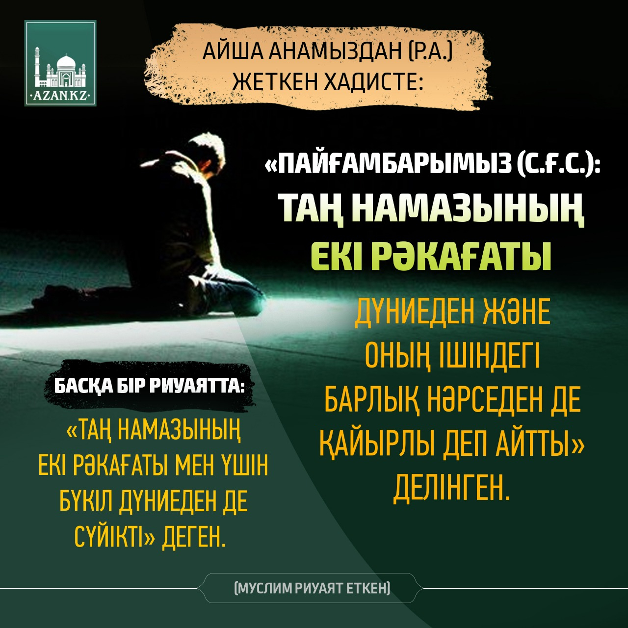 Айша анамыздан (р.а.) жеткен хадисте: «Пайғамбарымыз (с.ғ.с.): Таң намазының екі рәкағаты дүниеден және оның ішіндегі барлық нәрседен де қайырлы деп айтты» делінген. Басқа бір риуаятта: «Таң намазының екі рәкағаты мен үшін бүкіл дүниеден де сүйікті» деген. (Муслим риуаят еткен)