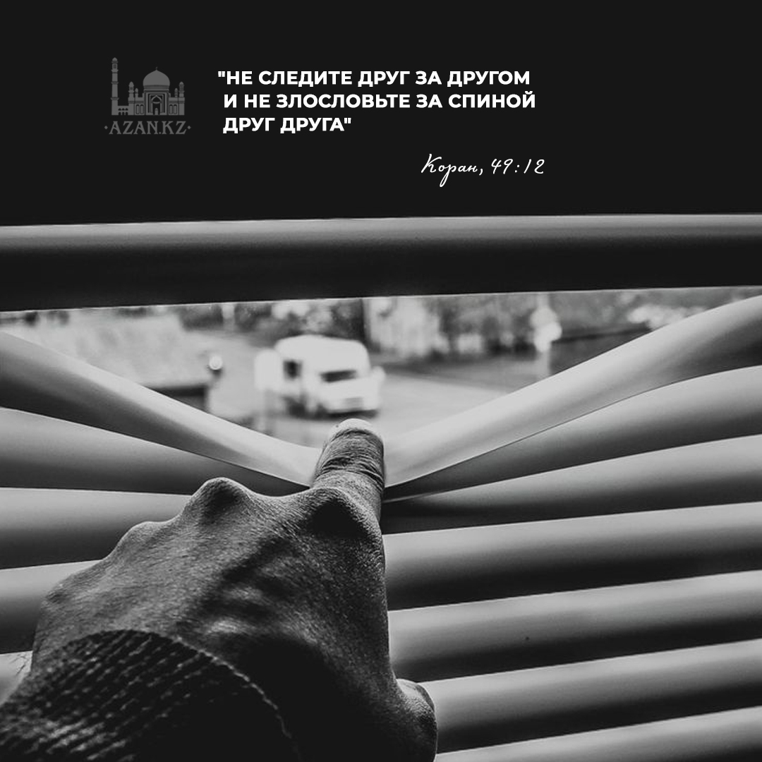 «О, верующие! Избегайте подозрений, ведь некоторые подозрения — это грех. Не следите друг за другом и не злословьте за спиной друг друга. Захочет ли кто-либо из вас есть мясо своего умершего брата? Вам же неприятно это! Бойтесь Аллаха! Поистине, Аллах — Принимающий покаяние, Милующий» (Сура «Аль-Худжурат», аят 12).