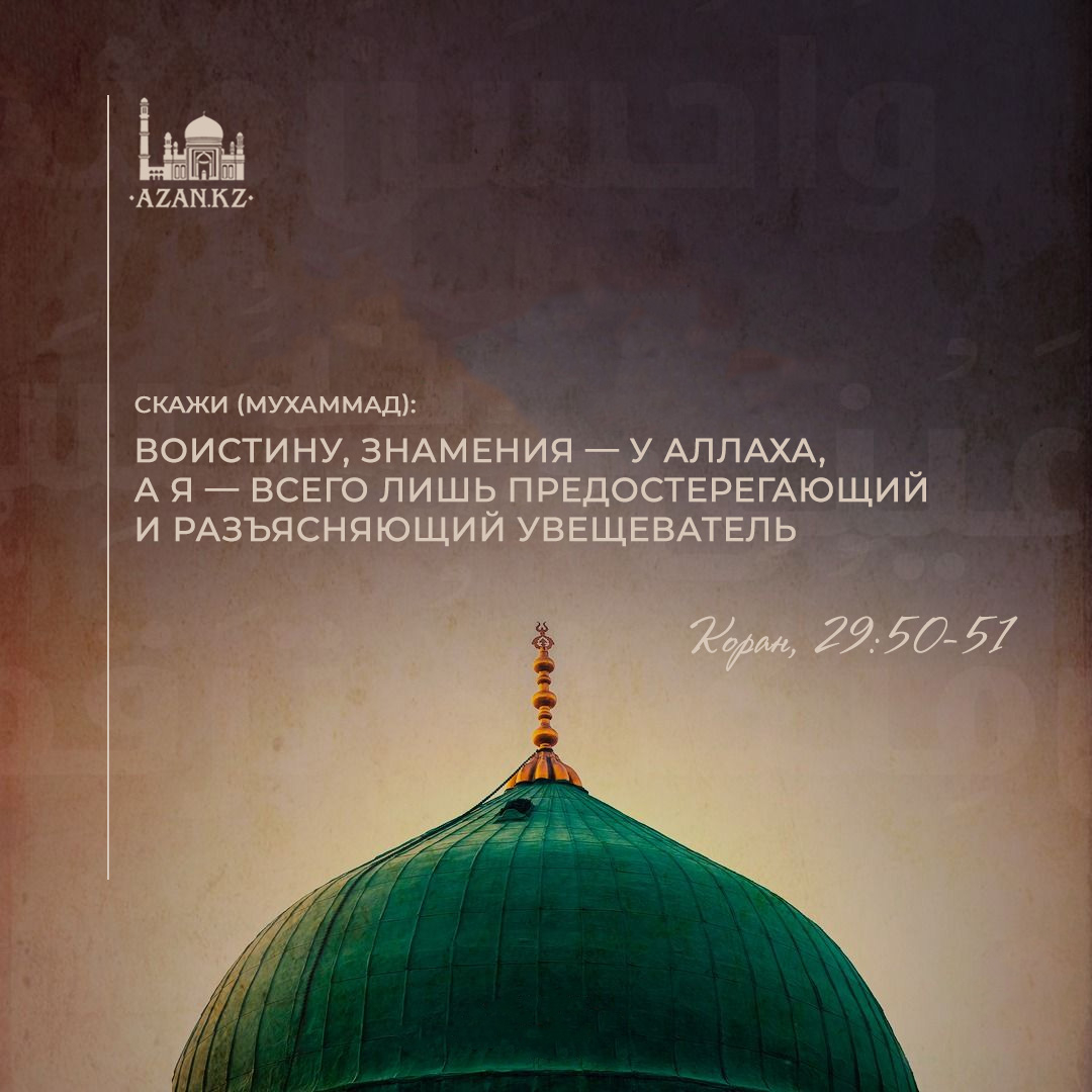 «…. Скажи: «Воистину, знамения — у Аллаха, а я — всего лишь предостерегающий и разъясняющий увещеватель» (29:50-51).