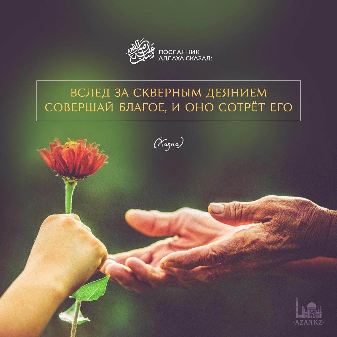 «Бойся Аллаха, где бы ты ни был, и вслед за скверным деянием совершай благое, и оно сотрёт его, и демонстрируй благой нрав в общении с людьми». (ат-Тирмизи)